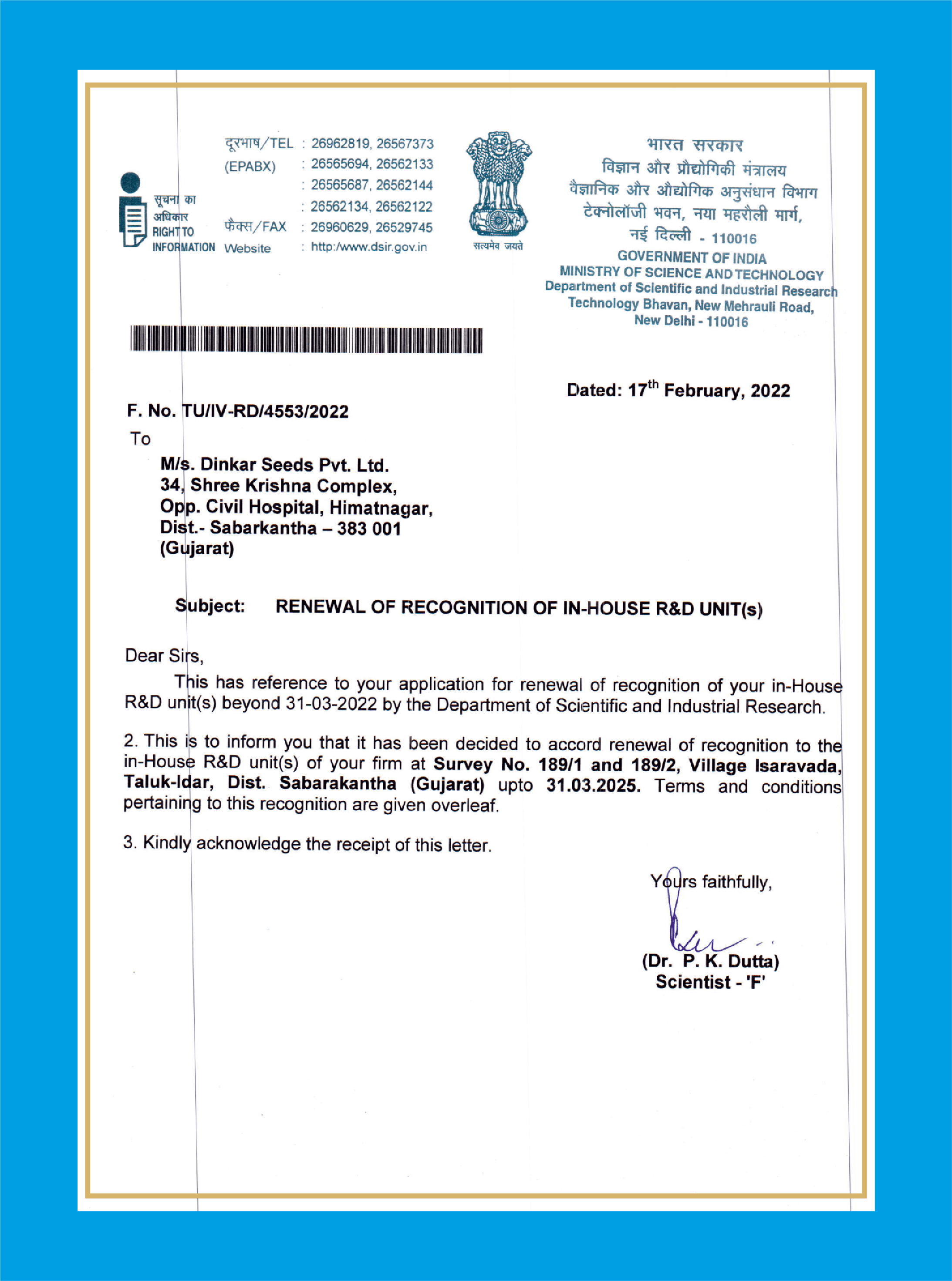 The company flourished under the dynamic leadership of Mr. K. C. Patel (B.sc. Agri.), "The son of soil' as Managing Director, The story of Dinkar Seeds Pvt Ltd begins with town (Himatnagar) Sabarkantha district, which is famous for Sabar Dairy and holy land 'Shamlaji' of famous God 'Shri Krishna'.